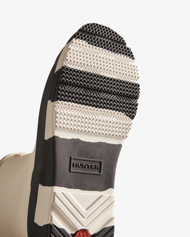 esta temporada, la bota corta y estilizada de Hunter se ha actualizado con una suela a rayas única. Esta bota blanca está confeccionada con caucho natural vegano certificado y tiene una suela de plataforma plana para máxima comodidad. es 100 % impermeable y está acabado con una lengüeta para facilitar la entrada del pie.