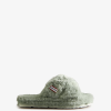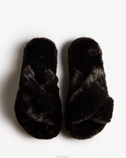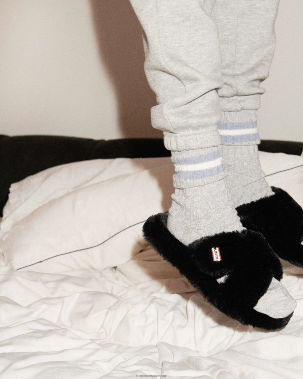 Las chanclas con plataforma plana de piel sintética de felpa están confeccionadas con correas cruzadas y una suela de plataforma. un compuesto de eva liviano y duradero en la plantilla brinda soporte y amortiguación. Esto se complementa con la exclusiva suela Hunter, que garantiza que se puedan usar en interiores y exteriores. Libres de crueldad animal, estas chanclas negras de piel sintética son completamente veganas y lujosas al tacto.