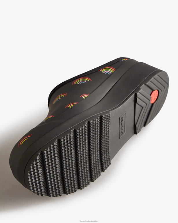 el zueco de juego, que se puede usar en interiores para una fácil protección o al aire libre como calzado de verano sin cordones en los meses más cálidos. , se ha actualizado esta temporada con un divertido mini estampado de arcoíris. Elaborado con el mismo caucho natural vegano certificado que nuestras icónicas botas de lluvia, este zueco es liviano, resistente a la intemperie y fácil de limpiar. Este zueco negro para mujer también cuenta con un forro y una plantilla de poliéster reciclado actualizados.