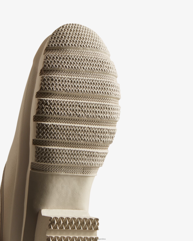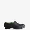 un zapato gris sin cordones hecho a mano con caucho vegano impermeable, Diseñado para jardinería. Actualizado con el icónico logo de la caja roja y plantilla reciclada, el zueco tiene una forma de caucho natural flexible y la banda de rodadura característica de Hunter que brinda agarre. forrado en neopreno para transpirabilidad y comodidad, protege de los elementos además de sujetar el pie.