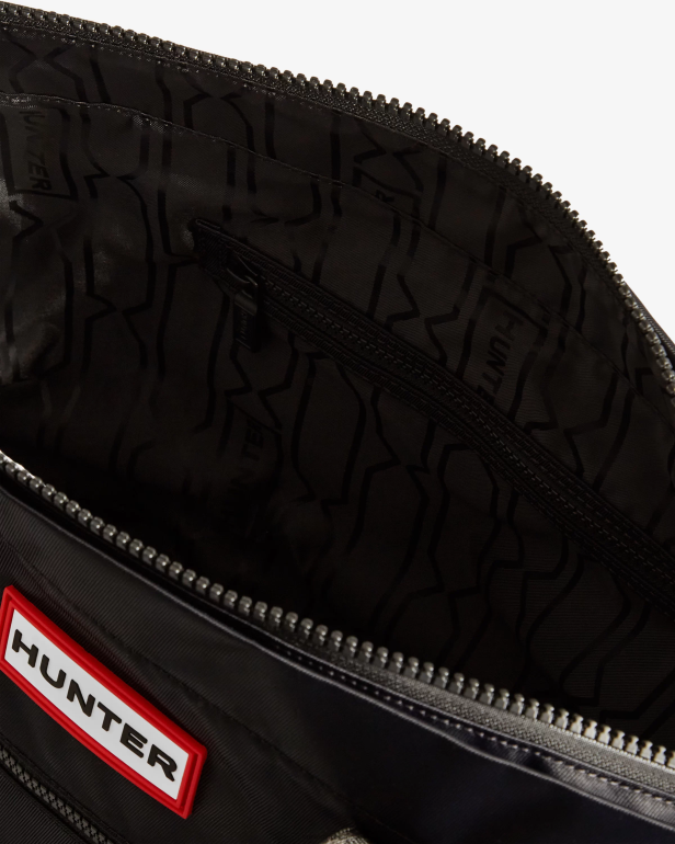 con un forro de poliéster reciclado, un exterior resistente al agua y una base reforzada, nuestro bolso tote mediano con clip superior de nailon negro protegerá sus pertenencias, sin importar el clima. Tiene el tamaño ideal para un kit de gimnasio o para hacer la compra y tiene una correa ajustable desmontable para poder transportarlo de varias maneras diferentes.